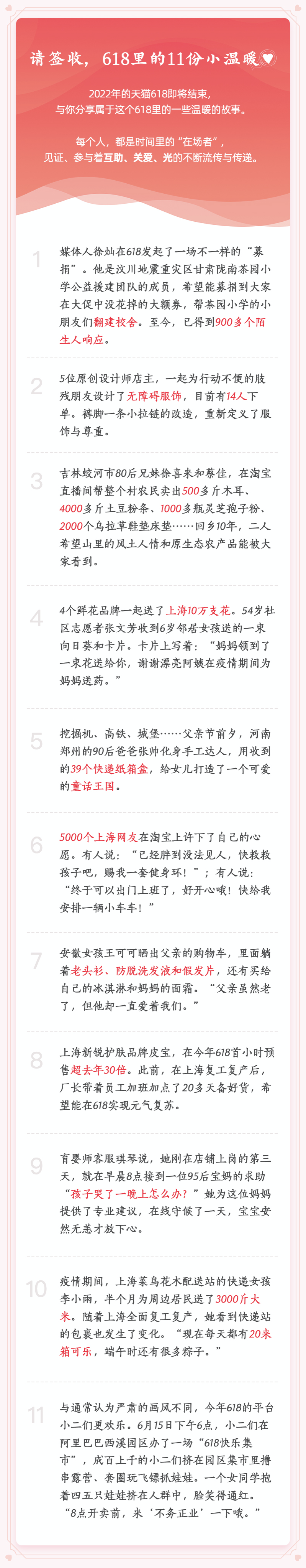 2022年的天猫618即将结束,记者看到,有一份“618里的11份小温暖”在网上流传。