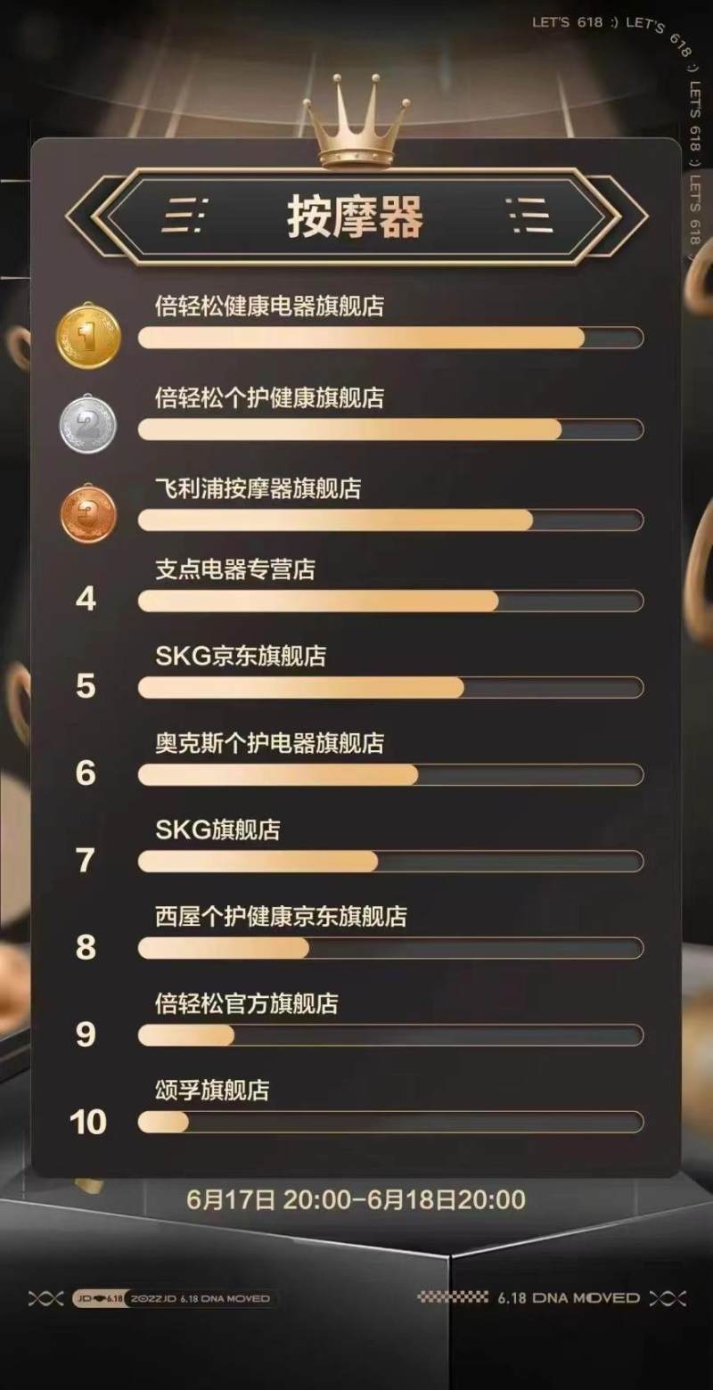据京东商智后台发布的数据,自5月31日20时至6月18日23时59分,整个618期间,倍轻松销售额位居按摩器店铺销售额第一。同时,以See 5R、iSee J为代表的眼部按摩器产品,以Dream 6、Scalp mini为代表的头部按摩器产品,以及姜小竹智能明火艾灸盒系列产品市占率及单品销售位居京东618品类第一。在6月17日20时至6月18日20时,倍轻松健康电器旗舰店与倍轻松个护健康旗舰店更在京东618最后一日霸榜按摩器店铺排名第一、第二。