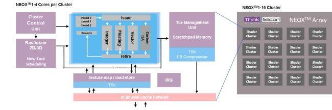 NEOX是一个基于RISC-V RV64C ISA指令集的并行多核和多线程GPU架构,带有自适应NoC。核的数量从4到64不等,组织在1-16个集群元素中,每个集群都配置了缓存大小和线程数。根据集群/内核的配置,NEOX的计算能力在800MHz下从12.8到409.6 GFLOPS不等,支持FP16、FP32和可选的FP64和SIMD指令。