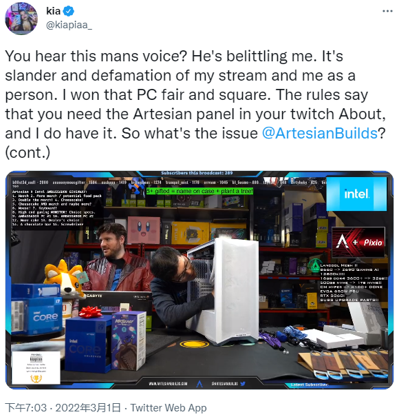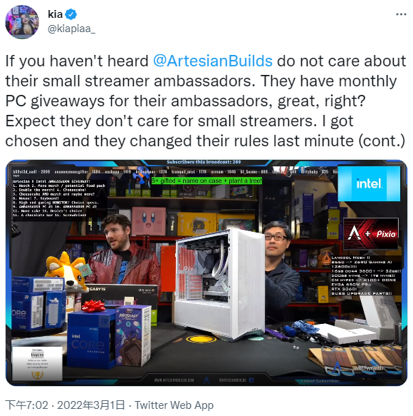 至于引发争议的那次直播抽奖活动,Artesian Builds 官方吐槽担任直播大师近三个月的 Kiapiaa 粉丝数少于 5000、且有效点击的转化率很不理想,结果 CEO Noah Katz 贸然扣留了该奖项。