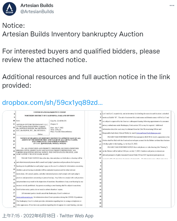 本次拍卖还包括 Artesian Builds 的一些无形资产 —— 包括业务和域名、约 1000 个影响力人士名单、以及一个商标。