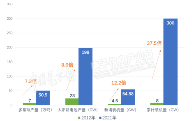 2012年,我国多晶硅产量7万吨,太阳能电池产量23GW,新增装机量4.5GW,累计装机量8GW。2021年,我国多晶硅产量50.5万吨,太阳能电池产量198GW,新增装机量54.88GW,累计装机量300GW,分别是10年前的7.2、8.6、12.2、37.5倍。