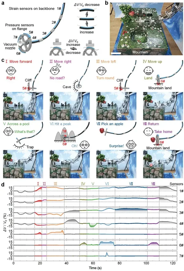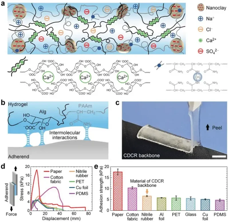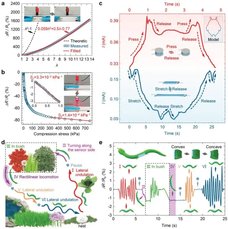 中国科学院宁波材料技术与工程研究所智能高分子材料团队研究员陈涛、副研究员高国荣,与精密运动机器人团队研究员张弛、高级工程师郑天江等合作,基于两个团队在离子导电凝胶领域(Adv. Mater, 2020, 32, 2004290;Nano Energy, 2021, 90, 106614等)与CDCR领域(IEEE Access, 2019, 11, 174236;Symmetry, 2019, 11, 1158等)的研究成果,运用由离子导电聚丙烯酰胺/海藻酸盐/纳米粘土聚合物复合水凝胶制成的类皮肤状水凝胶传感器,实现了CDCR柔性自我感知。