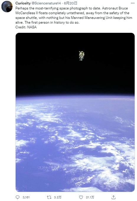 NASA表示,挑战者号上的另一名机组成员用一台70毫米的相机拍下了第一次无系绳太空行走的照片。虽然它现在才再次成为头条新闻,但他们早在1984年2月7日就拍摄了这张照片本身。不过,基于科学和自然的Twitter账户@Curiosity最近再次分享了这张照片,使其再次成为焦点。