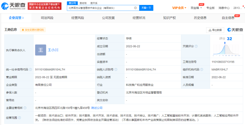 天眼查App显示,近日,北京百方众智信息技术合伙企业(有限合伙)成立,执行事务合伙人为搜狗公司原CEO王小川,经营范围含人工智能基础软件开发;计算机系统服务;人工智能应用软件开发等。合伙人信息显示,该企业由王小川,原搜狗COO茹立云共同持股。