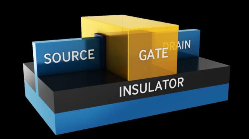 那我们就得看芯片里面晶体管的结构了,芯片里面的晶体管,是场效应晶体管。有一个源极(Source)、一个漏极(Drain)和一个栅极(Gate)。
