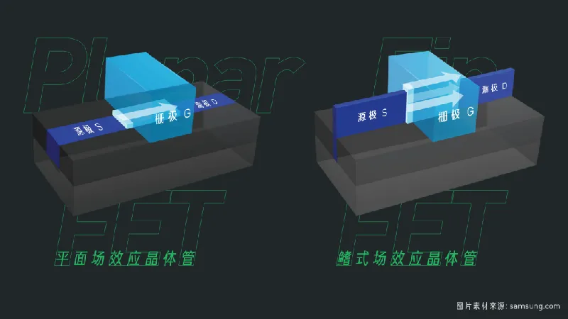 这个结构,看起来就是一个大鱼鳍。所以叫“鳍式场效应晶体管”,也就是FinFET。有了这个技术,才有了后来的14nm,10nm和7nm。