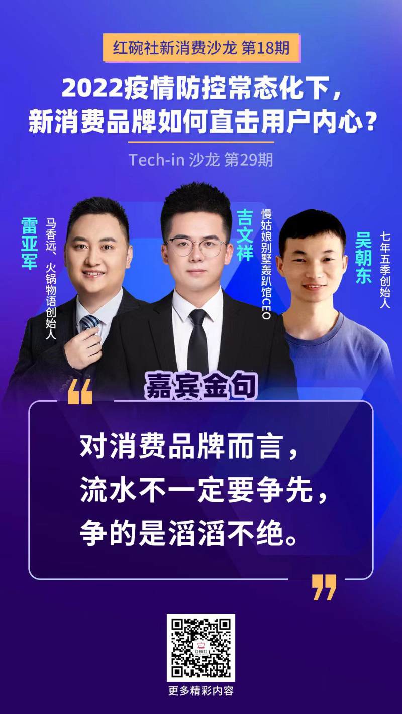 6月25日下午,Tech in沙龙第29期在钛客印众创空间举行,本期沙龙聚焦新消费行业时下热点分享,邀请了慢姑娘别墅轰趴馆CEO吉文祥、马香远创始人雷亚军、七年五季创始人吴朝东,一起探讨2022疫情防控常态化下,新消费品牌如何直击用户内心。
