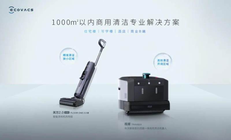 为了满足中小商用场景地面全域清洁的需求,科沃斯还推出了商用清洁机器人程犀和智能洗地机芙万2.0商用版(FLOOR ONE 2.0 Biz)组成的商用清洁整体解决方案。其中,两款智能清洁设备密切协作、明确分工——程犀负责开阔区域的高效清洁,芙万2.0商用版负责狭小空间的灵活清洁;此外,对于一些突发状况,例如不小心洒落的咖啡等,也可通过芙万迅速到位、即刻处理。