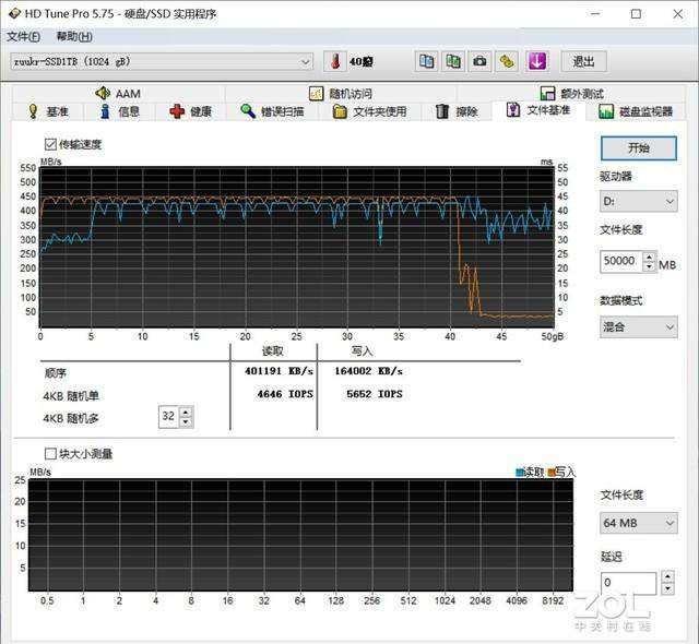 在进一步的测试中,我们向SSD里写入更多数据,开始会有规律地掉一下速度,在写入40G以后,速度就从450MB/s直接掉到了40MB/s,这个缓外速度比机械硬盘甚至USB 3.0优盘都拉胯,看来这款SSD的用料值得研究一下,我们直接开拆。