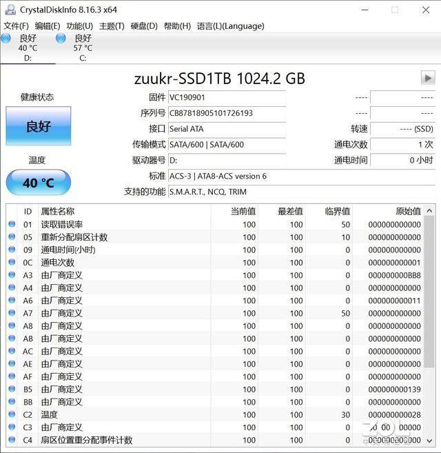 不过在CrystalDiskInfo中,读取到的数据明显有问题,品牌信息为zuukr查不到任何资料,其固件为2019年9月也未免太老,当时容量能达到1T的固态也屈指可数,所以这款SSD还值得深挖。