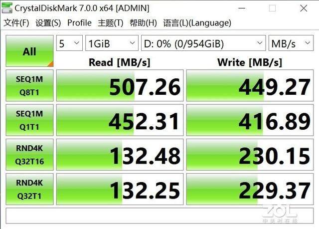 AS SSD测试中,连续写速442MB/s,连续读速466MB/s,CrystalDiskMark测试的结果类似,连续写速449MB/s,连续读速507MB/s,大概就是常见的2.5英寸SSD的速度,这个速度还是可以的。