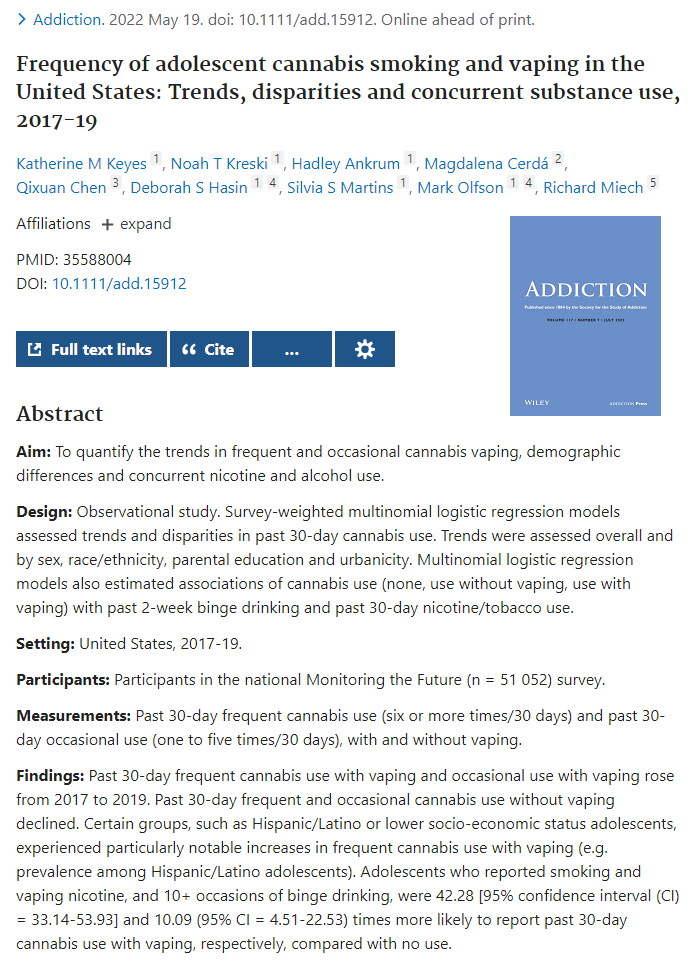Keyes 博士补充道:无论吸食电子烟与否,接触烟草、电子烟和酗酒等情况,都与大麻的频繁摄入有很密切的关联。