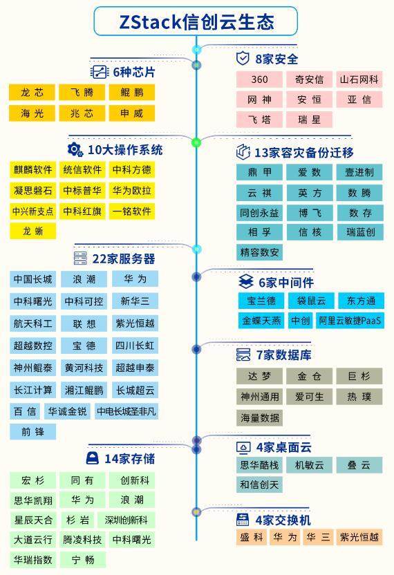 随着我国科技发展面临的外部环境进一步复杂化,我国实现核心科技的自主创新尤为重要,以信创云、CPU、操作系统为代表的信创产业近年来发展迅速。作为自主创新的开源云引擎,ZStack 具备完全自主知识产权,是和VMware、OpenStack等并行的独立云计算路线,支持“一云、多芯、多OS”的异构信创,适配超过100款信创软硬件产品,包括飞腾、龙芯、鲲鹏、海光、兆芯、申威 6 大主流信创芯片,以及麒麟软件、统信软件等主流信创操作系统。