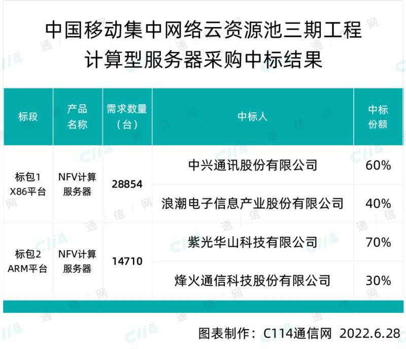 C114讯 6月28日消息(九九)中国移动今日发布集中网络云资源池三期工程计算型服务器采购中标结果公示,标包1(X86平台)的中标人为中兴通讯股份有限公司和浪潮电子信息产业股份有限公司。