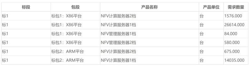 项目共划分2个标包,标包1为X86平台NFV计算服务器28854台,原则上选取2个中标人,以资源池为单位划分份额,每个中标人对应的分配份额原则上约为 60%、40%;标包2为ARM平台NFV计算服务器14710台,原则上选取2个中标人,以资源池为单位划分份额,每个中标人对应的分配份额原则上约为 70%、30%。