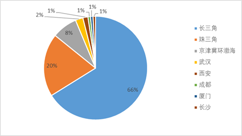 今年上半年的半导体投融资在地域上呈现一家独大的特点。上半年,66%的融资企业来自于长三角,20%来自珠三角,大量的半导体初创企业来自这两个三角洲,合计高达86%。京津冀环渤海地区分布着8%的融资企业,中西部贡献剩余的不到6%。