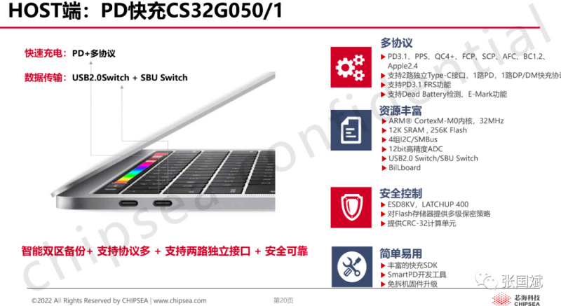 2021年5月,USB-IF协会发布了最新的USB PD3.1快充标准,引爆了整个会场,快充从手机蔓延到多个领域,而芯海的快充芯片犹如天女散花般从CS32G020演进到多个专用PD芯片,如针对电源的CSU3AF10,针对PC领域的CS32G051,芯海还将推出针对车规的快充芯片。
