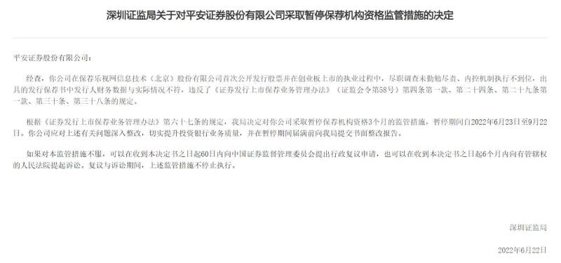 深圳证监局发文表示,平安证券在保荐乐视网首次公开发行股票并在创业板上市的执业过程中,尽职调查未勤勉尽责,出具的发行保荐书中发行人财务数据与实际情况不符,因此采取暂停保荐机构资格3个月的监管措施,暂停期间自2022年6月23日至9月22日。