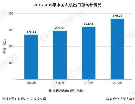 而从近几年我国农机行业的外贸发展现状看,2016-2019年我国农机出口额逐步提升,由2016年的273.65亿元,增加值2019年的370.25亿元,比2018年增长14.82个百分点。中国农机出口额的大幅增加,一方面表现出我国农机制造业的发展,另一方面也表明我国农机竞争力的显著提升。