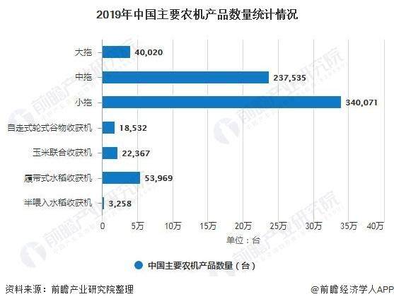 目前,我国农机产品主要以拖拉机、谷物收割机、玉米收割机、水稻收割机等产品为主。具体看,2019年大拖40020台,同比-1.12%;中拖237535台,同比增长11.13%,小拖340071台,同比增长3.13%。