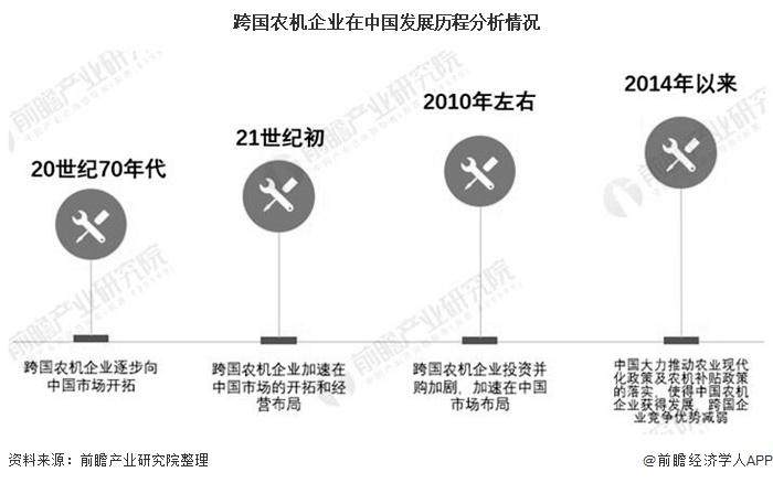 新中国成立初期,我国农业生产几乎全是人力手工传统生产方式,全社会90%以上的人搞农业,农机作业量很少,农业生产力低下。随着我国经济技术水平的不断提升,现代农业装备已在农业生产中大量应用。农机行业发展初期,多以跨国农机产品的应用为主,总体分析,跨国农机企业在我国基本经历了市场初探-加速开拓-投资并购和与中国企业同步竞争的发展历程。而近年来,我国农机企业的综合竞争力不断提升。