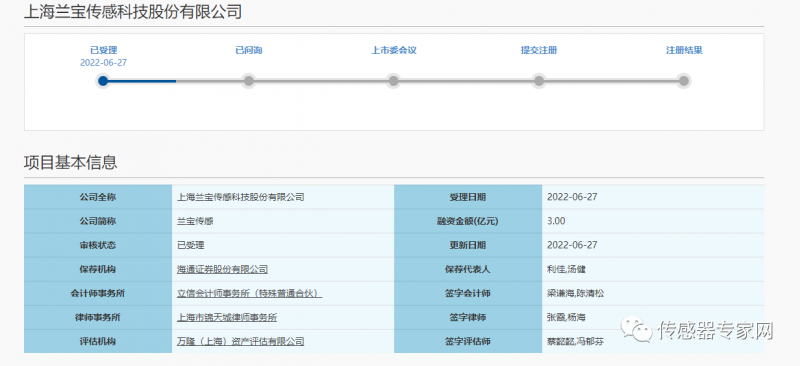 上交所6月27日披露,工业传感器企业上海兰宝传感科技股份有限公司(简称“兰宝传感”)科创板IPO申请获受理。公司本次拟公开发行股份不超过1334万股,募集资金总额3亿元,用于智能传感器项目、智能环保项目等。