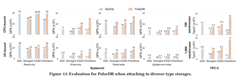 同时, 为了证明我们的优化效果不仅仅对于我们自己的云存储PolarStore 有收益, 对于所有的云存储应该都有收益, 因此我们将针对云存储优化的PolarDB 运行在 StorageX, ESSD 等其他云存储上, 我们发现均能获得非常好的性能提升, 从而说明我们的优化对于大部分云存储都是有非常大的收益