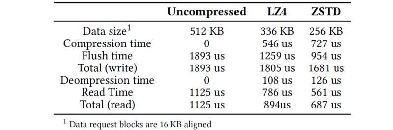 在RocksDB中有许多加速数据访问的技术,主要有prefetching, filtering 和compression机制。考虑到云存储的特性,这些技术(经过适当改造)在云存储环境中更有价值。经过分析和实验,我们提出了以下建议:1)预读机制能加速部分查询和compaction操作,建议compaction操作开启预读并设定合理的预读I/O任务优先级,并将单个预读操作的大小对齐存储粒度,对于查询操作预读应由用户场景确定;2)在云存储上建议开启bloom filters,并且将filter的meta和常规数据分离,将filter信息并集中管理;3)采用块压缩来减小数据访问的整体用时,如下表展示了数据量和PolarFS访问延时,表中存储基于RDMA,在延迟更高的存储环境中,压缩收益更高,引入压缩后数据访问的整体延时(特别是读延时)下降。