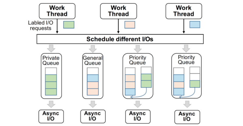 在多核硬件环境中,我们引入了一个多队列I/O模型并在RocksDB中拆分I/O任务和工作任务(例如压缩作业和刷新作业)。这是因为我们通过调整I/O线程的数量来控制较好吞吐和延迟关系。由于将I/O任务与后台刷写作业分离,因此无需进一步增加刷写线程的数量,刷写线程只会对齐I/O请求并进行调度分发。RocksDB本身提供了基于线程角色的优先级调度方案,而我们的调度方法这里是基于I/O标签。