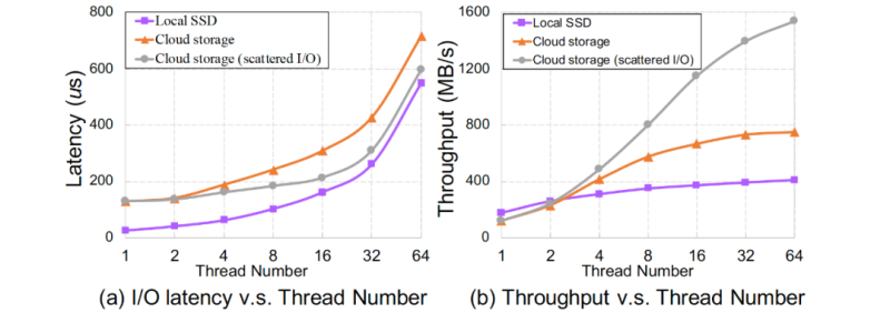 云存储和本地SSD存储在带宽、延迟、弹性、容量等方面存在巨大差异,例如图2展示了在稳态条件下本地SSD与云存储I/O延时、带宽与工作线程关系,它们对数据库等设计有着巨大影响。此外,共享存储的架构特性也会对云存储带来影响,如多个节点之间的数据一致性增加了维护cache一致性开销。