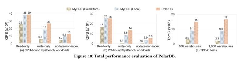 为了验证我们的优化效果, 我们对比了为针对云存储优化的MySQL 分别运行在PolarStore 和 Local Disk, 以及我们优化以后的PolarDB, 从下图可以看到PolarDB 在CPU-bound, IO-bound sysbench, TPCC 等各个场景下都表现除了明显的性能优势。