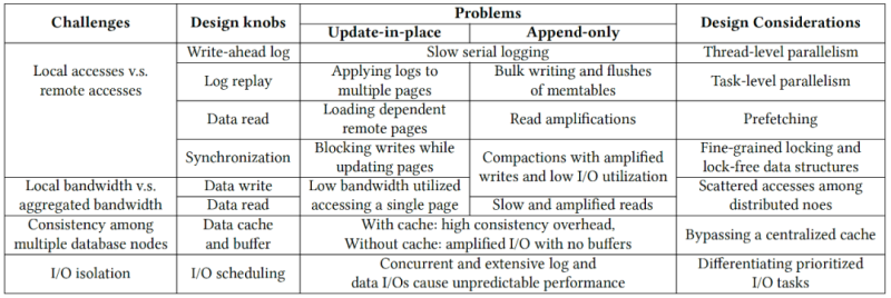 针对不同的数据存储引擎,如基于B-tree和LSM-tree的存储引擎,这些特性差异会带来不同的性能差异,表1归纳总结了这些挑战及其对数据库设计的影响。其中有共性问题,如WAL路径写入变慢、共享存储(分布式文件系统)cache一致性代价等;也有个性问题,如B-tree结构在独占资源情况下做远程I/O、远程加剧I/OLSM-tree读放大影响等。