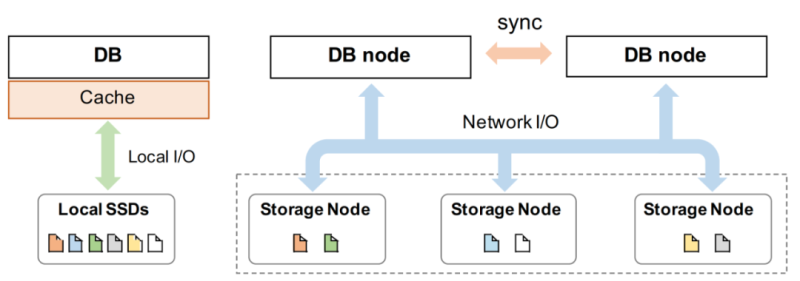 图1展示了本地数据库(不含备份)与shared-storage云原生数据库的系统结构,AWS Aurora首先引导了这种从本地数据库向shared-storage云原生数据库的迁移。它将数据库分为存储层和计算层,并可以独立扩展每一层。为了消除了传输数据页中产生的沉重的网络开销,它进一步定制了存储层,在数据页上应用重做日志,从而不再需要在两层之间传输数据页。无疑这种设计在云中提供了一种非标准存储服务,只能由Aurora的计算层使用。