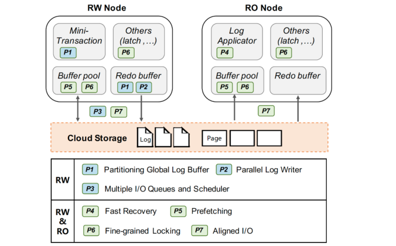 去除 Data I/O合并:在本地数据库中,数据页的I/O会被合并来形成大的I/O实现连续地顺序写入。在云存储中,并发地向不同存储节点写入具有更高的性能,因此在云存储的数据库上,可以无需数据页的I/O合并操作。