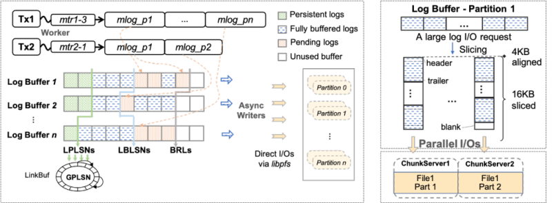 Redo日志分片:InnoDB的redo采用的是Physiological Logging的方式,大部分MTR针对单个的数据页(除部分特殊),页之间基本相互独立。如图5(左),我们将redo日志、redo缓冲区等按其修改的page进行分片(partition),分别写入不同的文件中,来支持并发写log(以及并发Recovery,并发物理复制等),从而在并发写友好的分布式文件系统上的获得写入性能优势。