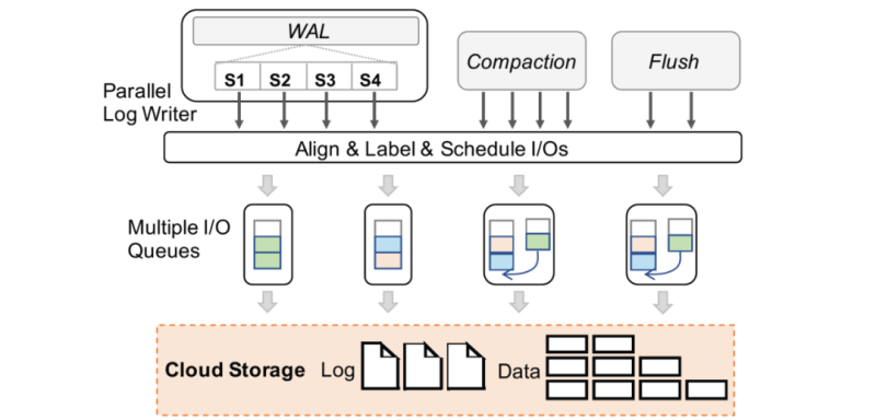- Scheduling Prioritized I/O Tasks:由于访问链路更长(如路径中存在更多的排队情况),不填I/O请求间的隔离性相对本地存储更低,因此需要在DB层面对不同I/O进行打标、调度优先级,例:优先WAL、预读分级。