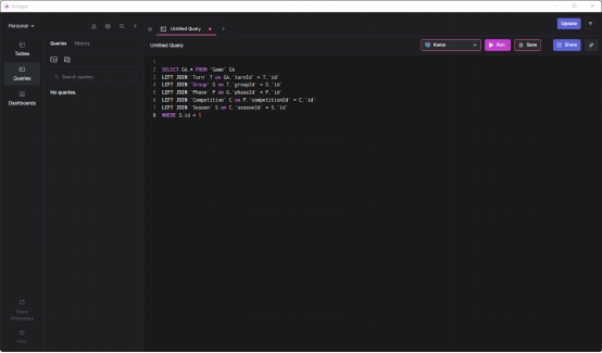在后台,来自 JOIN 查询的原始数据首先被解耦,然后在应用程序级别转换为相应的表示。因此,在处理所有数据时,具有数百列的数千条记录成为一个小组数据,每个数据都具有数据模型类中定义的属性。因此,包含从数据库中提取的原始数据的数组将成为一组Game对象。每个Game对象都有一个包含其各自Turn实例的turn字段。然后,该Turn对象将有一个Group字段存储其各自的Group对象等。