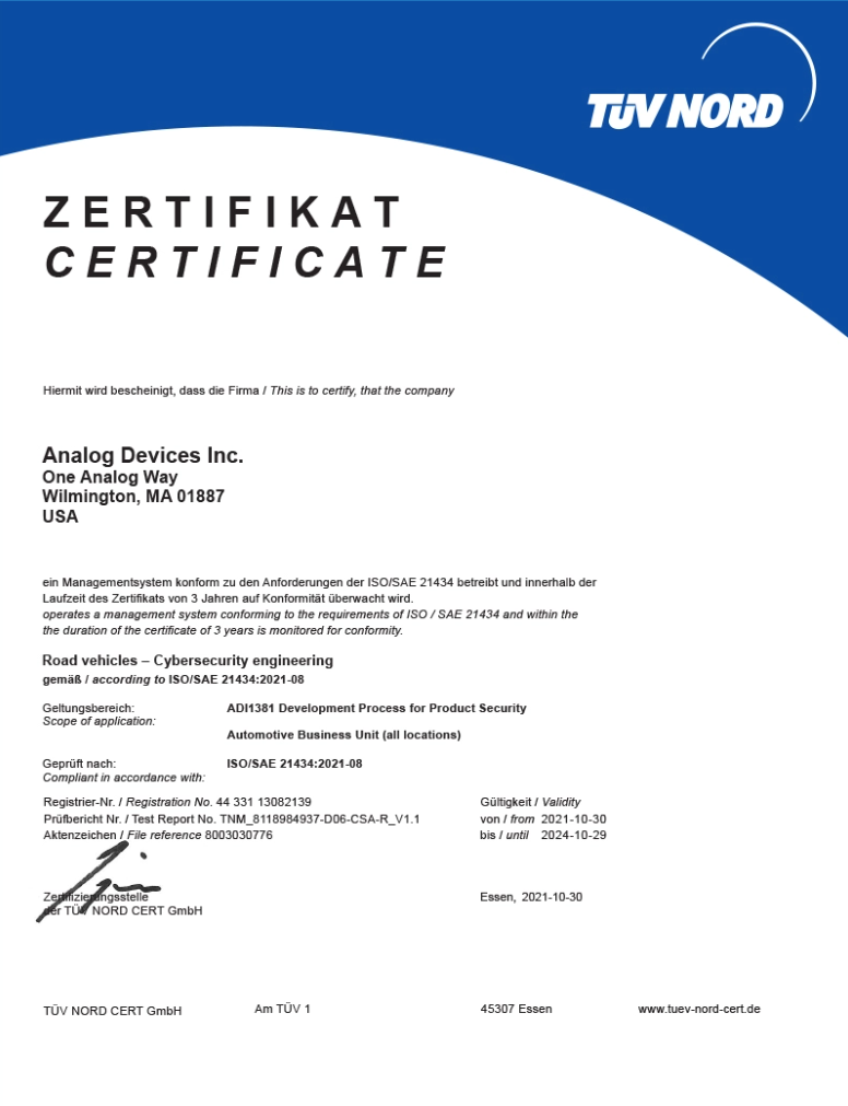 ADI 预见到 ISO/SAE 21434 标准在其起草期间解决的核心网络安全问题,并将它们纳入我们自己的 wBMS 设计和开发精神中。我们很自豪能够成为首批在我们的政策和流程上实现 ISO/SAE 21434 合规性的技术供应商之一,并且目前正在对 wBMS 技术进行认证,以达到最高的网络安全保证级别。