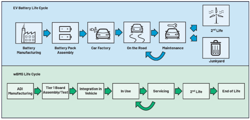 图 2. EV 电池生命周期及其相关的 wBMS 生命周期。