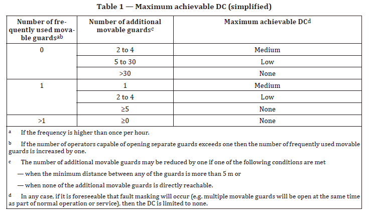 因篇幅所限,就不再详述DC和PL之间的对应关系。标准中提供了一个简单工具,可用于快速、简单地评估开门数量对于DC的影响。前两列变量分别为“需要频繁开启的防护门数量”和“其余安全门的总数”。