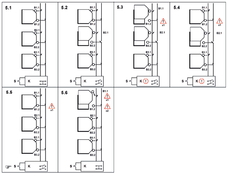 5.3图,B1打开,并且触点B1.2粘连无法断开,但此时由于两个输入通道都因为B2的缘故处于断开状态,因此安全继电器并未检测到B1发生的故障。