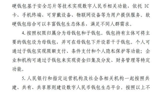 该白皮书明确指出:数字人民币“按照载体分为软钱包和硬钱包。软钱包基于移动支付 APP、软件开发工具包(SDK)、应用程序接口(API)等为用户提供服务。硬钱包基于安全芯片等技术实现数字人民币相关功能,依托 IC卡、手机终端、可穿戴设备、物联网设备等为用户提供服务。软硬钱包结合可以丰富钱包生态体系,满足不同人群需求”。