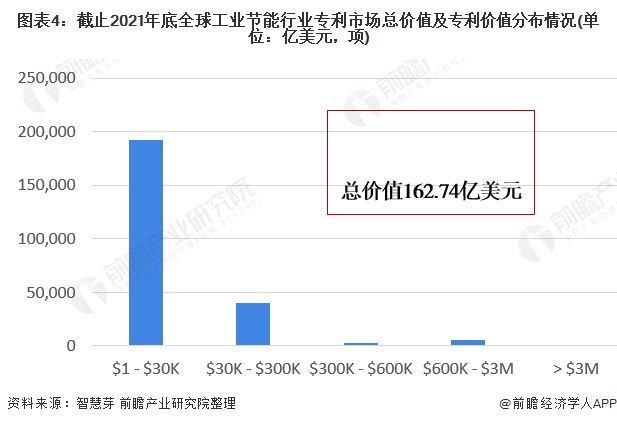 4)全球工业节能行业专利市场价值:总价值高达百亿美元,3万美元以下专利数量较多