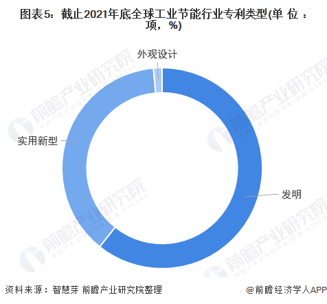 在专利类型方面,目前全球有22万项工业节能专利为发明专利,占全球工业节能专利申请数量的60.71%,其次是工业节能发明专利,数量为14万项。外观设计型工业节能专利数量为5008项。