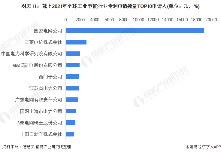 其中,国家电网公司工业节能专利申请数量最多,为19045项。三菱电机株式会社排名第二,其工业节能专利申请数量也超过2000项。