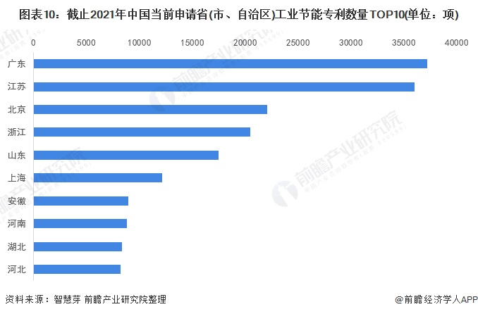 中国方面,广东为中国当前申请工业节能专利数量最多的省份,累计当前工业节能专利申请数量高达37216项。江苏、北京、浙江当前申请工业节能专利数量均超过2万项。中国当前申请省(市、自治区)工业节能专利数量排名前十的省市还有山东、上海、安徽、河南、湖北和河北。