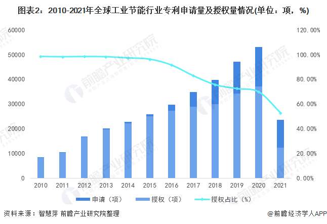 在专利授权方面,2010-2020年全球工业节能行业专利授权数量逐年增长,2021年授权数量较2020年出现下降,2021年全球工业节能行业专利授权数量为12491项,授权比重仅为52.92%。