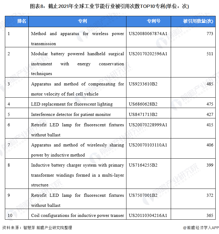 专利号为US20080067874A1和专利号为US20170202596A1的两大专利是被引用次数最多的两大工业节能专利,两者被引用次数均超过500次。其它被引用次数前十大专利如下所示: