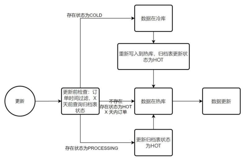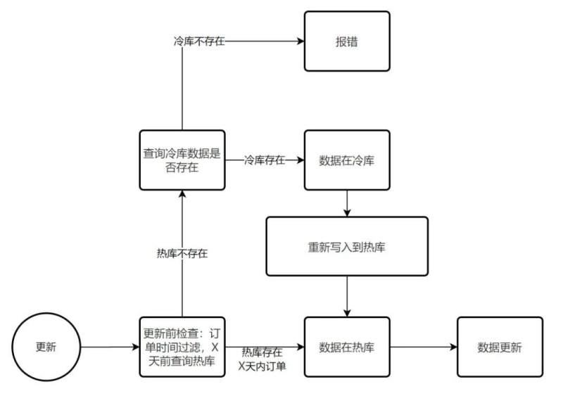 方案二:适用于冷库性能较低,涉及的插入、更新、查询大部分无法根据单号过滤时间时,需要热库归档表中转过滤。